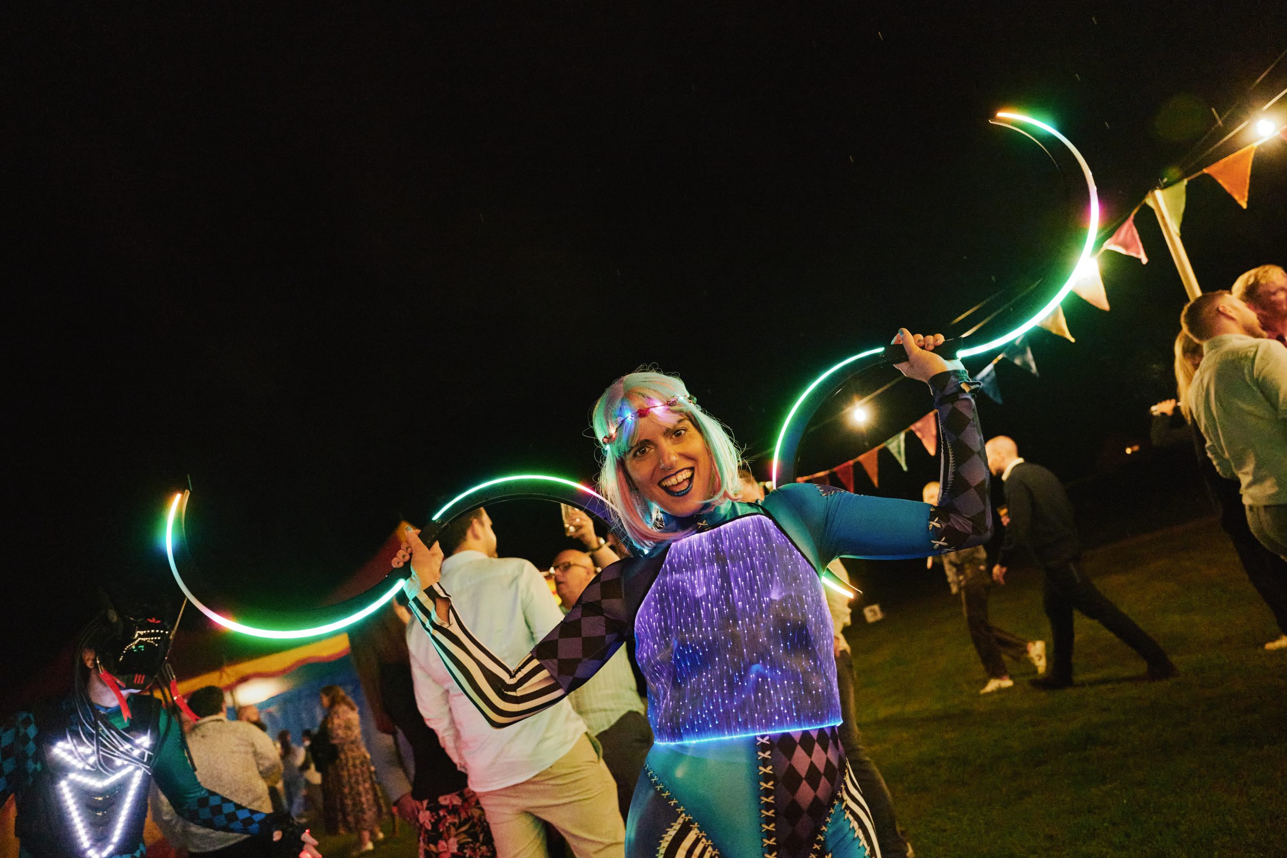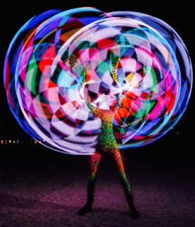 Mit hochwertigen Lighttoys LED-Requisiten wie Hula-Hoops, Jonglierkeulen, Buugengs und Poi, perfekt zur Musik programmiert, schaffen wir eine magische Atmosphäre voller Energie und Emotion.
